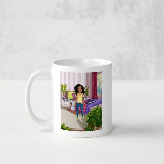 The mug showcases the main character, Journey, in her room. This image from the book is printed on two sides of this ceramic mug.