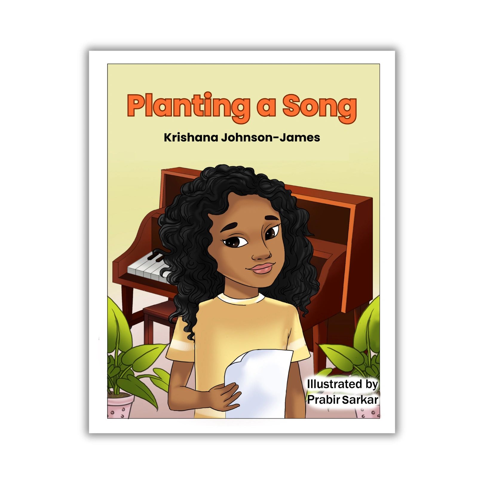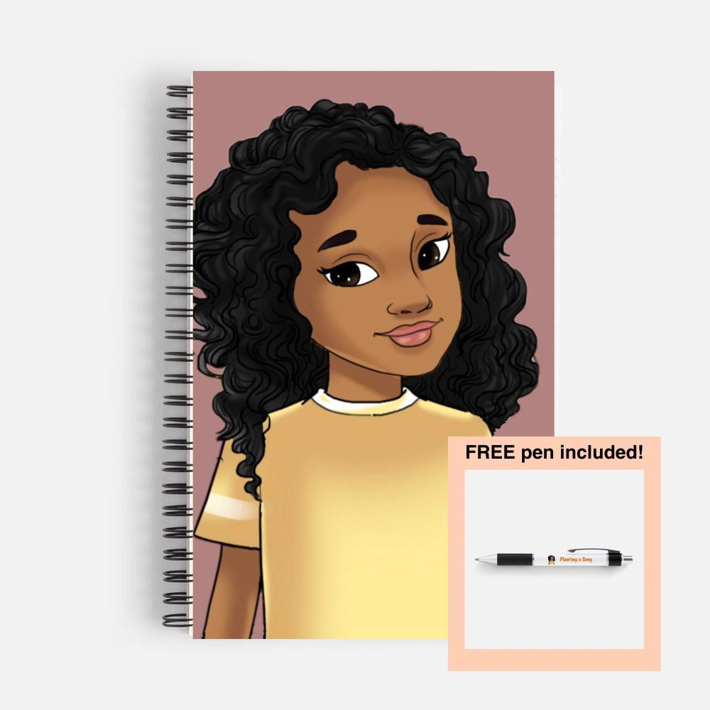 The cover of this notebook showcases the main character, Journey, from the book, Planting a Song.